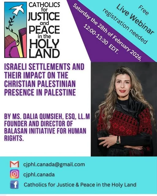 Catholics for Justice and Peace in the Holy Land is a group of Canadian Catholics “who seek an end to the occupation and a just peace for all living in Palestine and Israel.” It is announcing its 5th webinar, “Israeli Settlements and Their Impact on the Christian Palestinian Presence in Palestine,” presented by Ms. Dahlia Qumsieh, founder and director of Balasan Initiative for Human Rights, Saturday, 28 February, 12:00-13:30 ET. Qumsieh is a brilliant lawyer who often speaks to groups of pilgrims and international visitors on settlement expansion, especially within the Bethlehem governate; her website is here. The webinar is free, but registration is required. Register here.